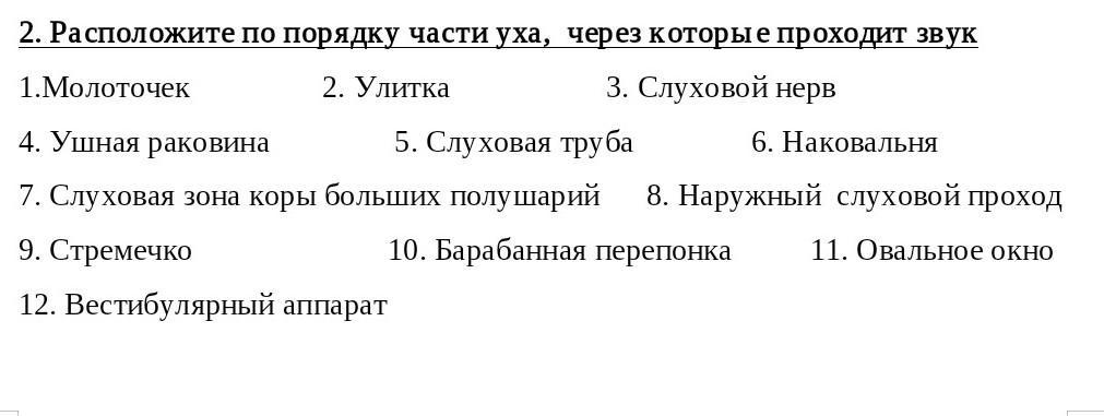 Наружнее ухо, ушная раковина, слуховой проход, барабанная перепонка, среднее ухо; слуховая или евстахиева, труба; слуховые косточки; молоточек, наковальня, стремечко; внутреннее ухо, улитка, полукружные каналы, вестибулярный аппарат