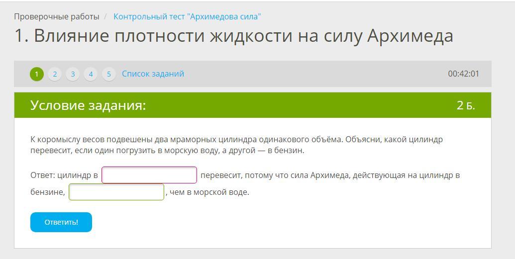 К коромыслу весов подвешены два мраморных цилиндра одинакового объёма. Объясни, какой цилиндр перевесит, если один погрузить в морскую воду, а другой — в бензин.