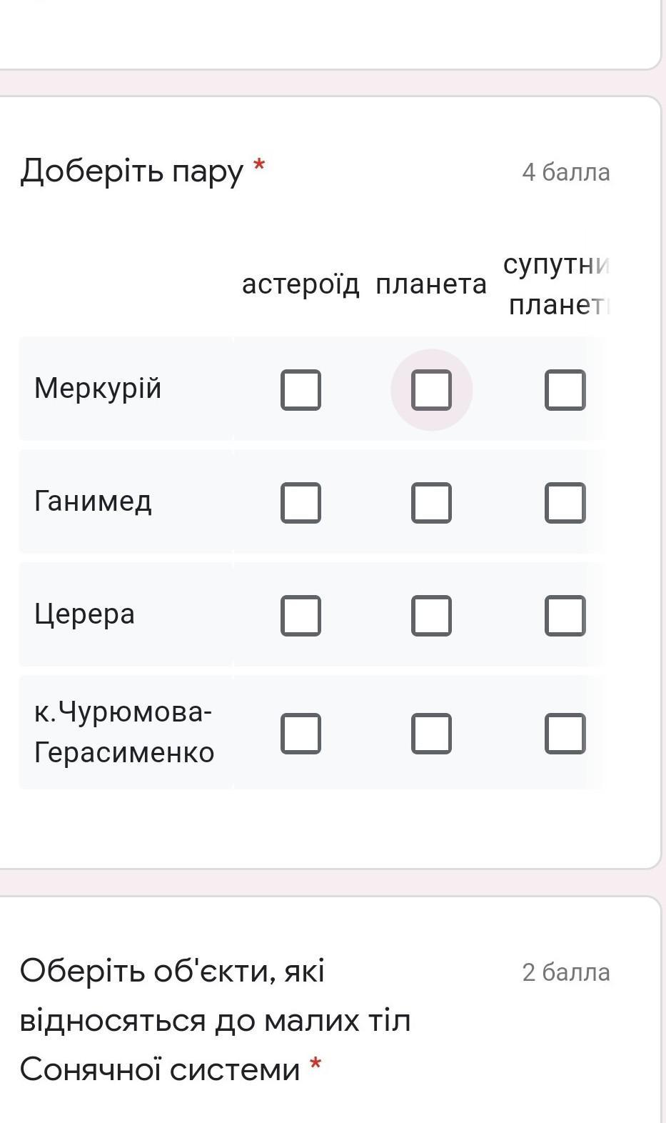 Церера, Меркурий - планеты, Ганимед - спутниковая планета. к.Чурюмова-Герасименко это комета, я не знаю почему вас нету такого варианта ответа.