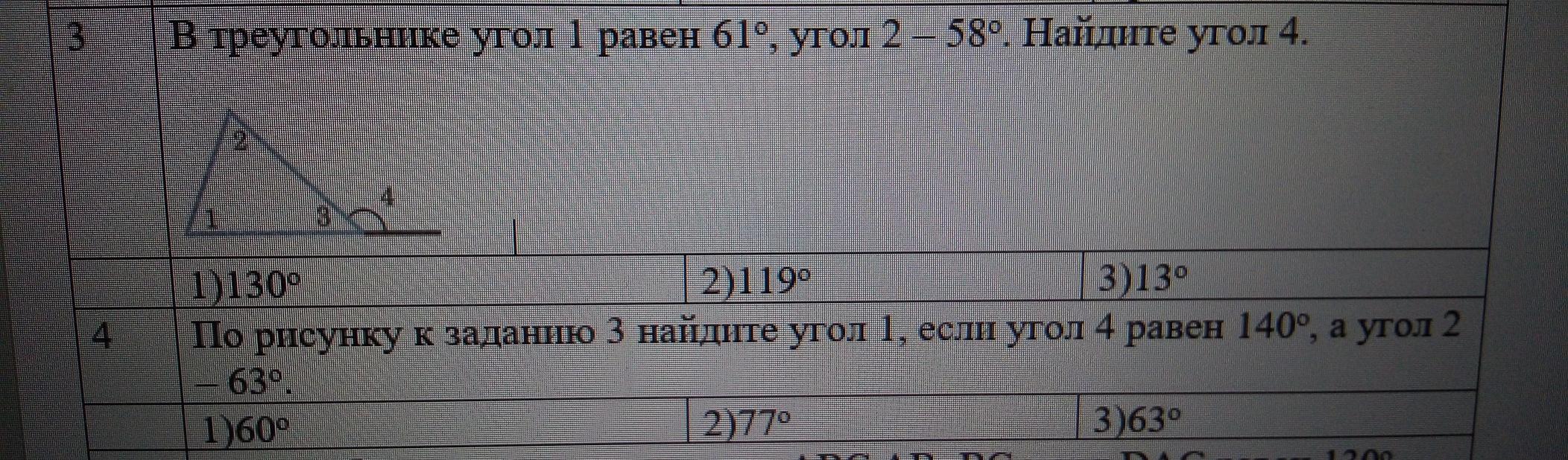 В треугольнике угол 1 равен 61 градусов, угол 2 58 градусов. Найдите угол 4