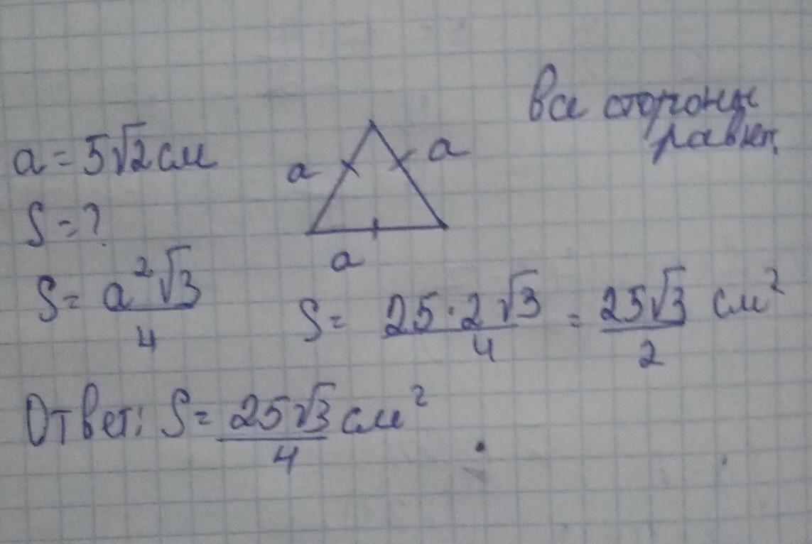 S=(5√2)²*√3/4=25*2*√3/4=25√3/2= или=12,5√3 см²