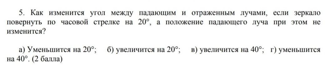 В случае, если источник света находится справа от перпендикуляра в точке падения луча на зеркало, то поворот зеркала по часовой стрелке приведет к уменьшению угла падения на 20° и такого же уменьшения угла отражения.