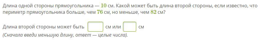 Длина одной стороны прямоугольника — 10 см. Какой может быть длина второй стороны, если известно, что периметр прямоугольника больше, чем 76 см, но меньше, чем 82 см?