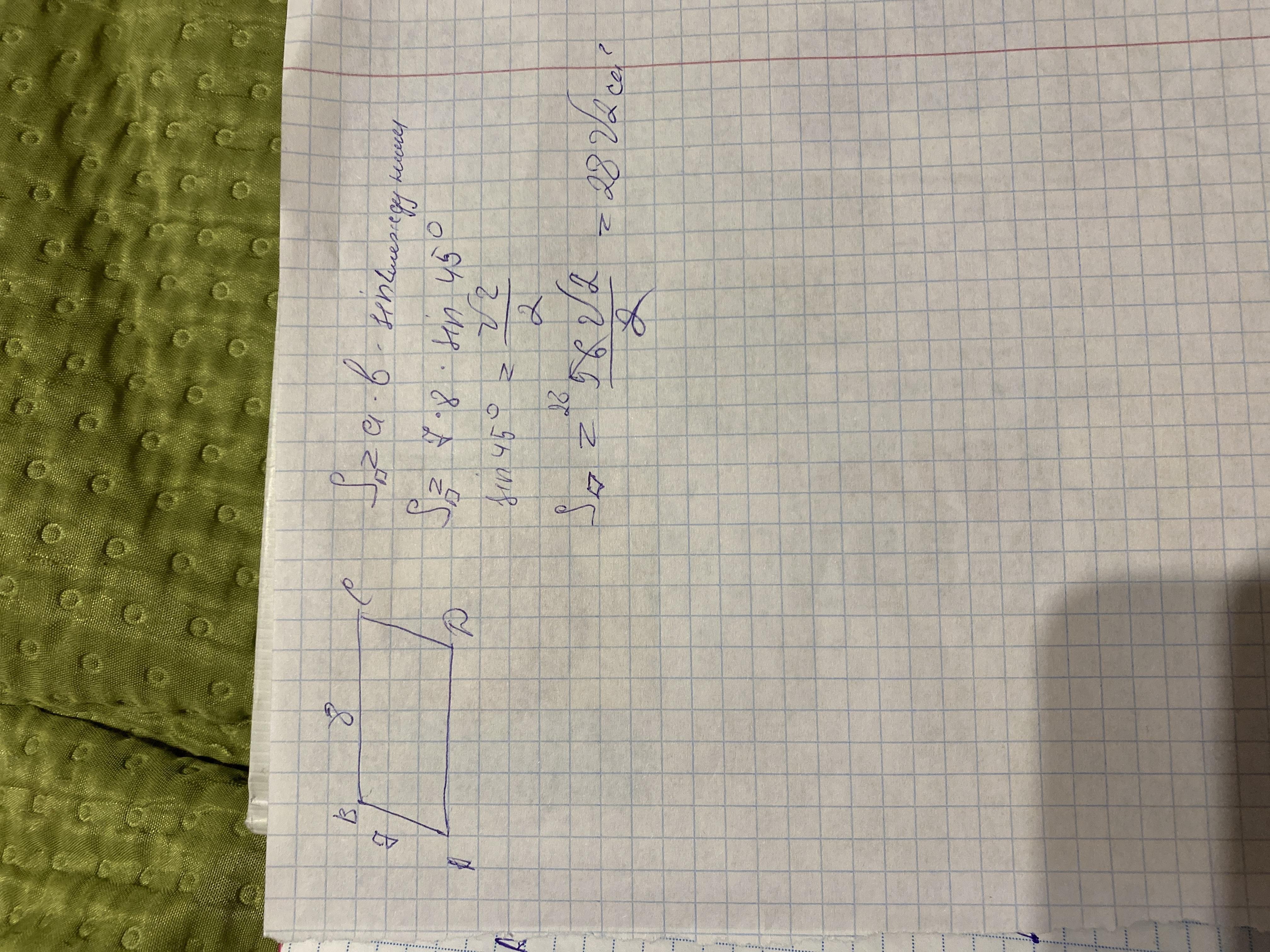 найдите площадь параллелограмма со сторонами 7 см и 8 см если меньший угол в параллелограмме равен 45°
