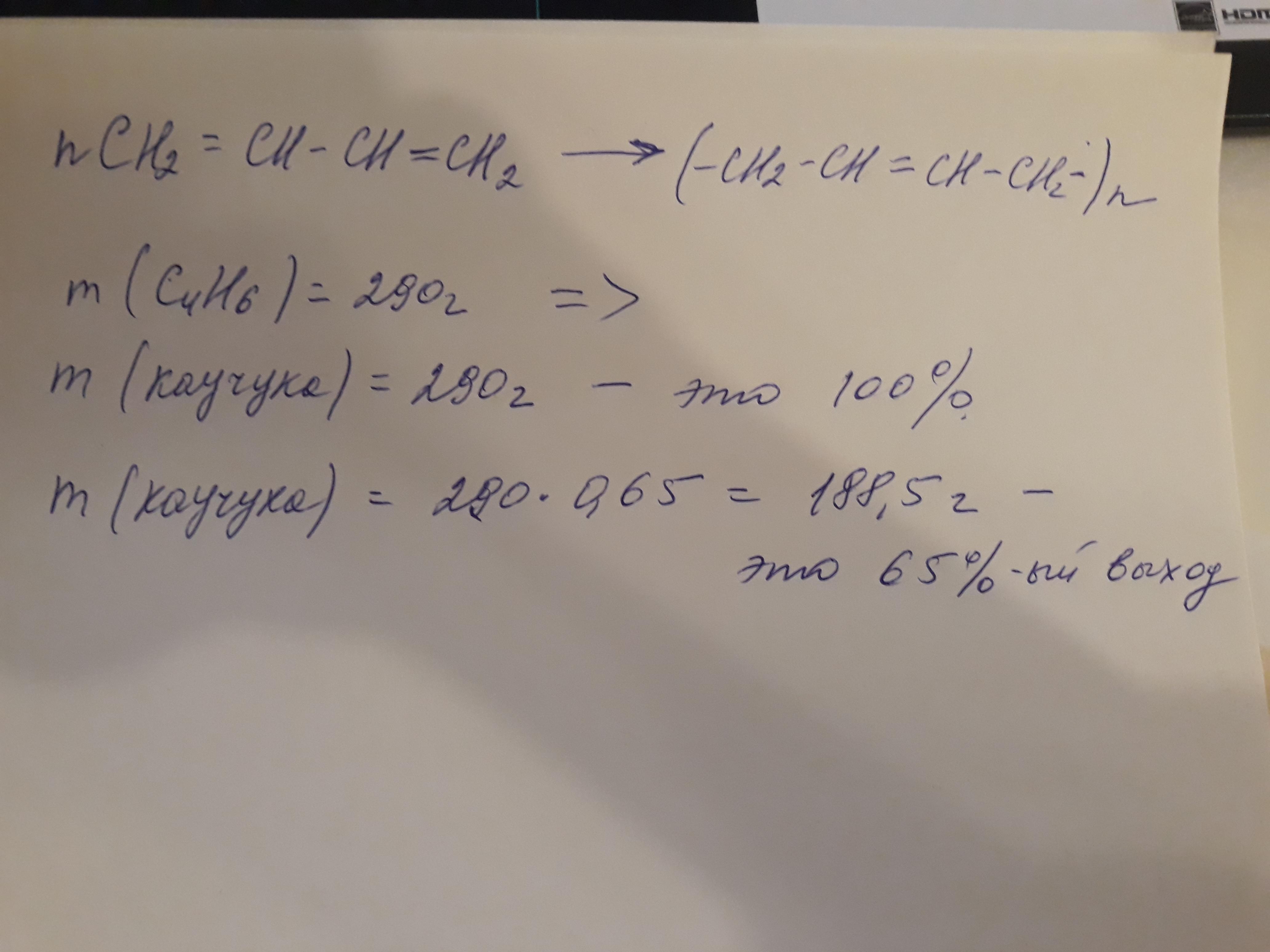 Какую массу бутадиенового каучука можно получить при полимеризации 290 г бутадиена, если реакция происходит с выходом 65 %?