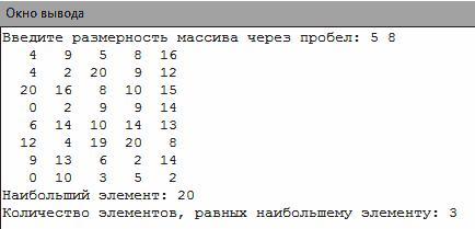 В двумерном массиве произвольной размерности подсчитать количество элементов, равных наибольшему элементу в этом массиве. Вывести значение наибольшего элемента.