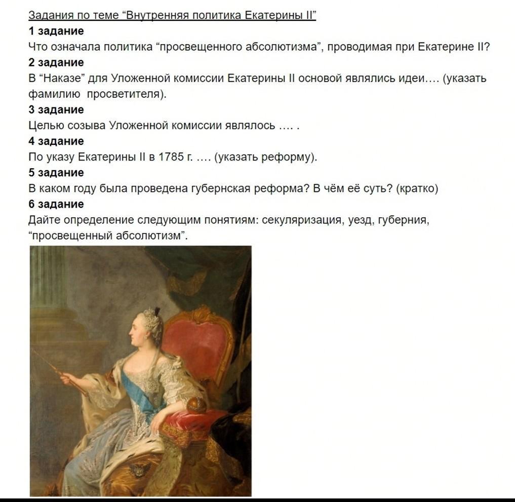2 - в "Наказе" она подчёркивала свою приверженность идеям Дидро, Монтескьё, Д`Аламбера и других просветителей.