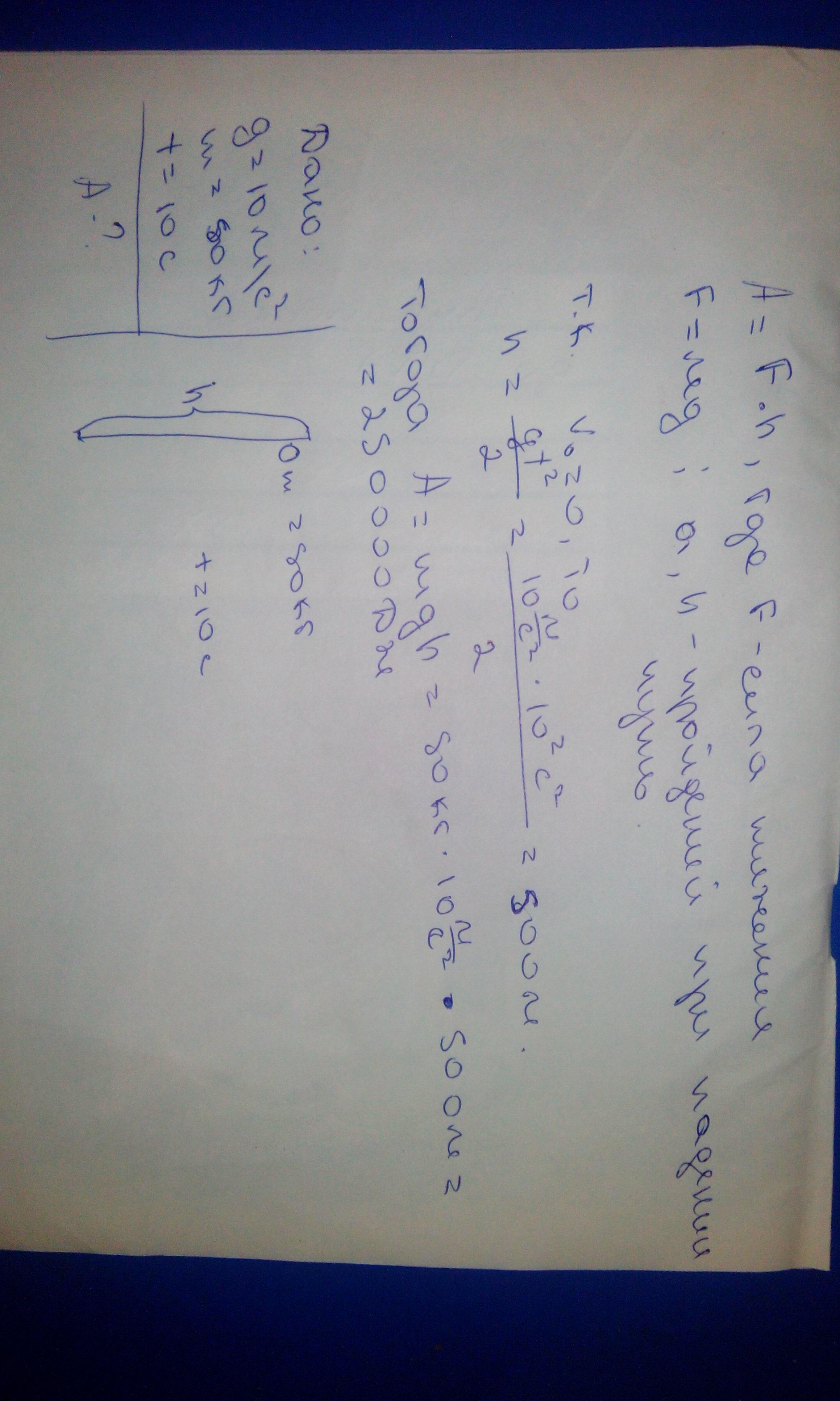 Груз массой m=50 кг свободно падает с установившейся скоростью Vуст=10м/c в течении t0=10 c. Какую работу совершает сила тяжести за этот промежуток времени? Какую мощность развивает сила тяжести в данной ситуации? Ускорение свободного падения g=10м/c^2. Ответы выразить в единицах Си, округлив до целых. можете написать просто ответ, чтобы обьяснения не писать