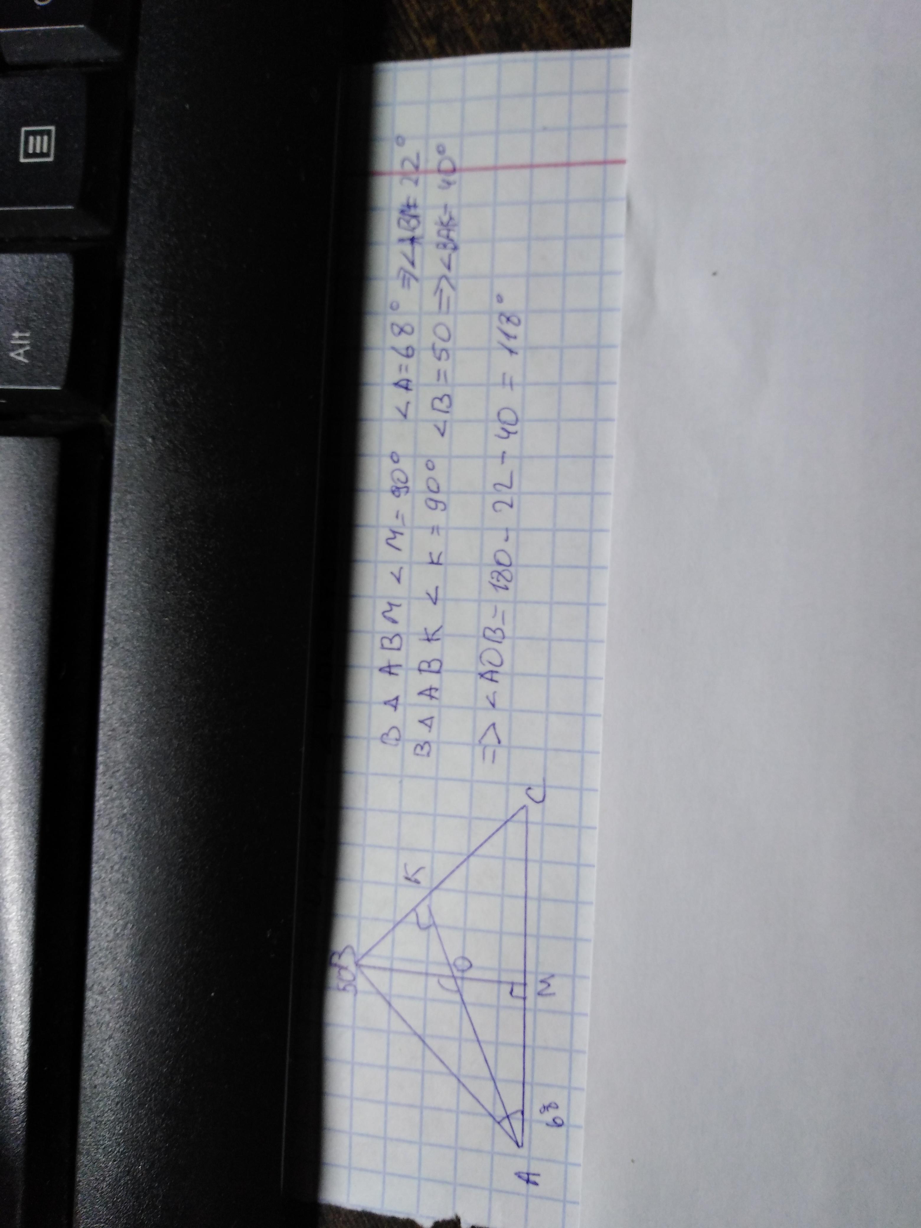 В треугольнике АВС высоты АК и ВМ пересекаются в точке О. Найдите угол АОВ, если угол А=68°, угол В=50°.