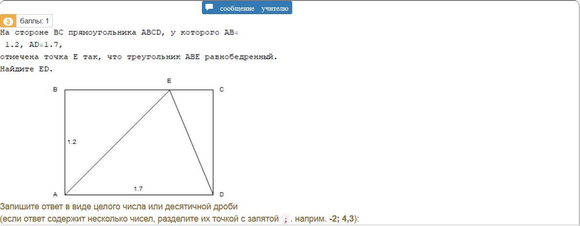 1)По условию треуг.АВЕ - равнобедренный => АВ = ВЕ = 1.2 => ЕС = 1.7 - 1.2 = 0.5(так как ВС = АD).
