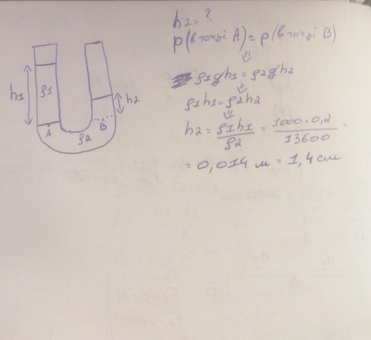 В U -подібній трубці міститься вода та ртуть. Висота стовпа води 20 см. Визначити висоту стовпа ртуті в трубці, якщо густина води 1000 кг/м3, а ртуті-13600 кг/м3. *