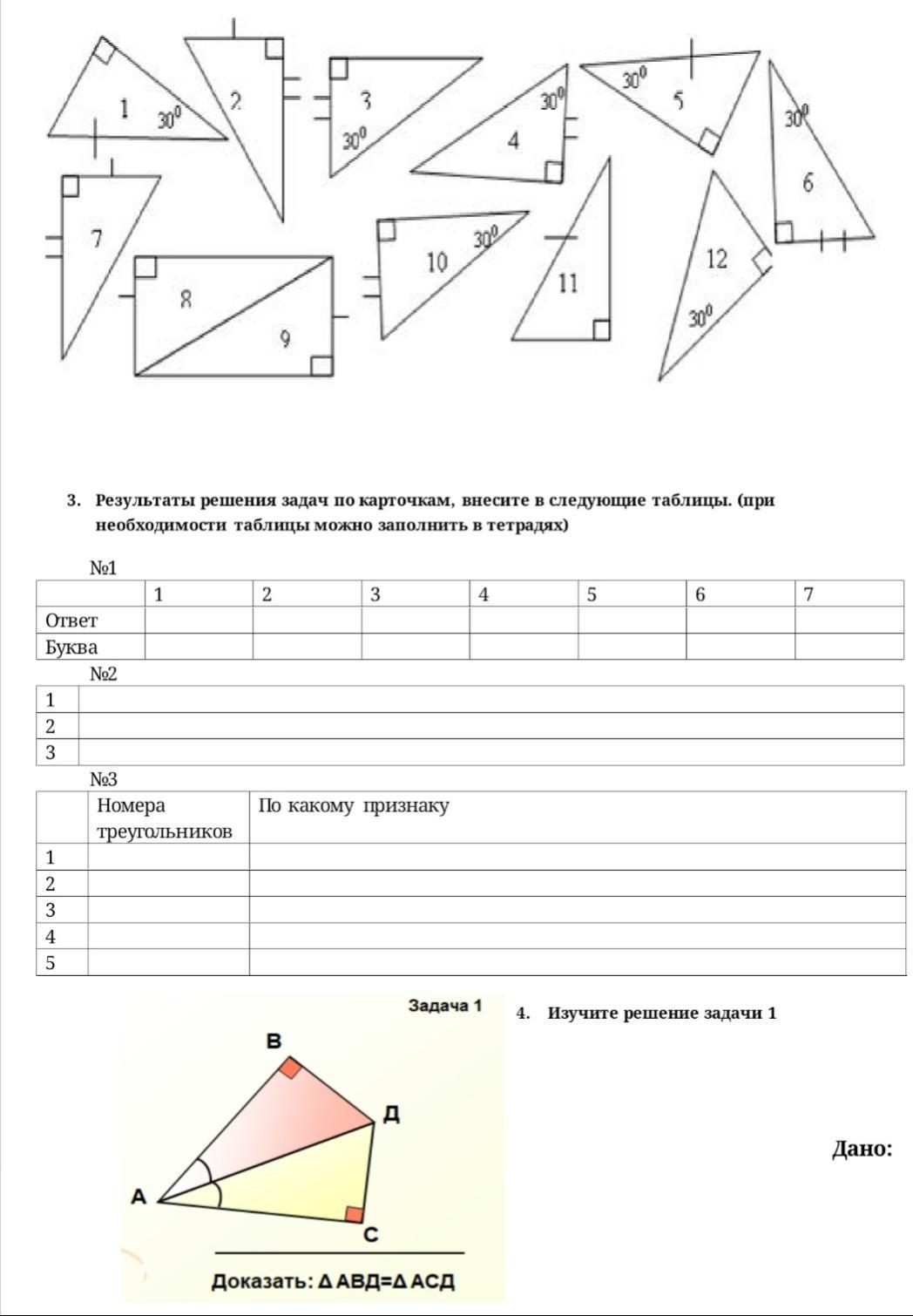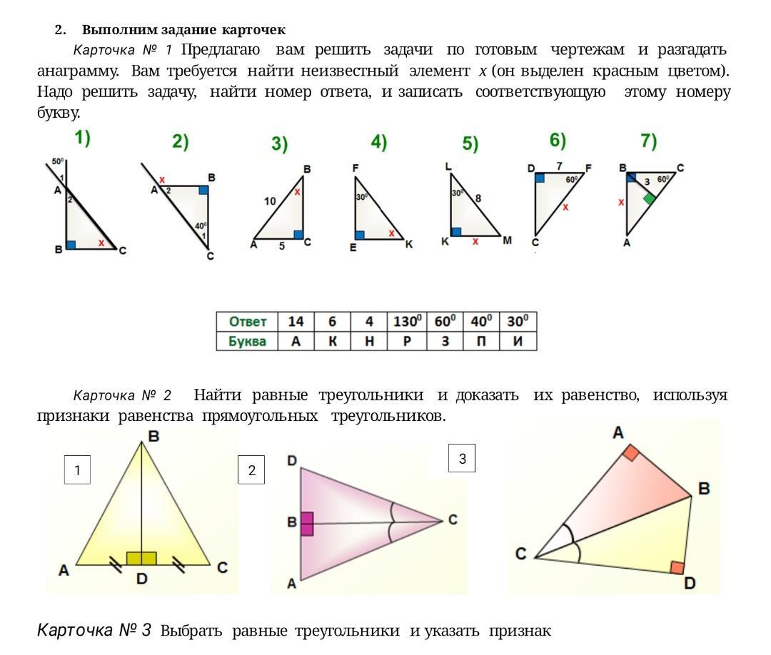 Карточка2. №1 ΔАВД=ΔСВД по двум катетам (ВД-обшиий катет, АД=СД по условию. №2 ΔСДВ=ΔСАВ по катету ВС-общий, и прилежащему острому углу ∠ВСД=∠ВСА по условию №3 ΔАВС=ΔДВС по гипотенузе ВС-общая и острому углу ∠АСВ=∠ДСВ по условию.