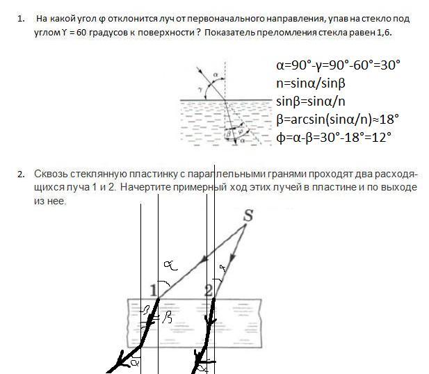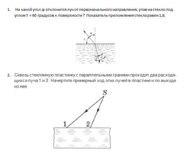 1.На какой угол ϕ отклонится луч от первоначального направления, упав на стекло под углом ϒ = 60 градусов к поверхности ? Показатель преломления стекла равен 1,6.