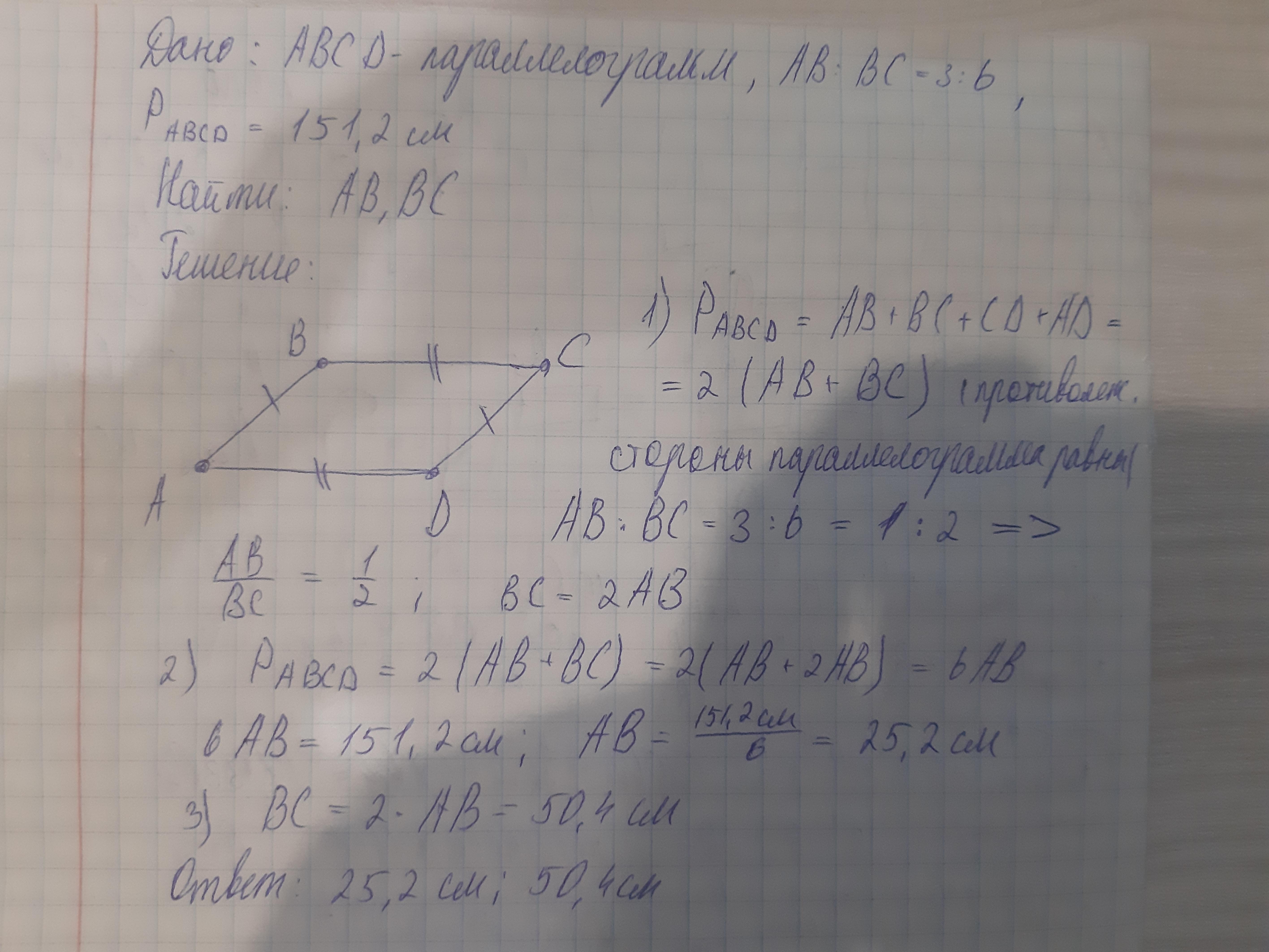 Стороны параллелограмма соотносятся как 3:6, а периметр равен 151,2 см. Вычисли стороны параллелограмма.
