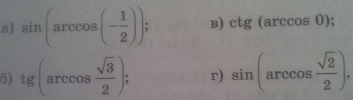 а) арккосинус -1/2 =2п/3, синус 2п/3 =корень из 3 делённый на 2, б) арккосинус корня из 3 делённое на 2 = п/6, tg п/6 = 1/ на корень из 3