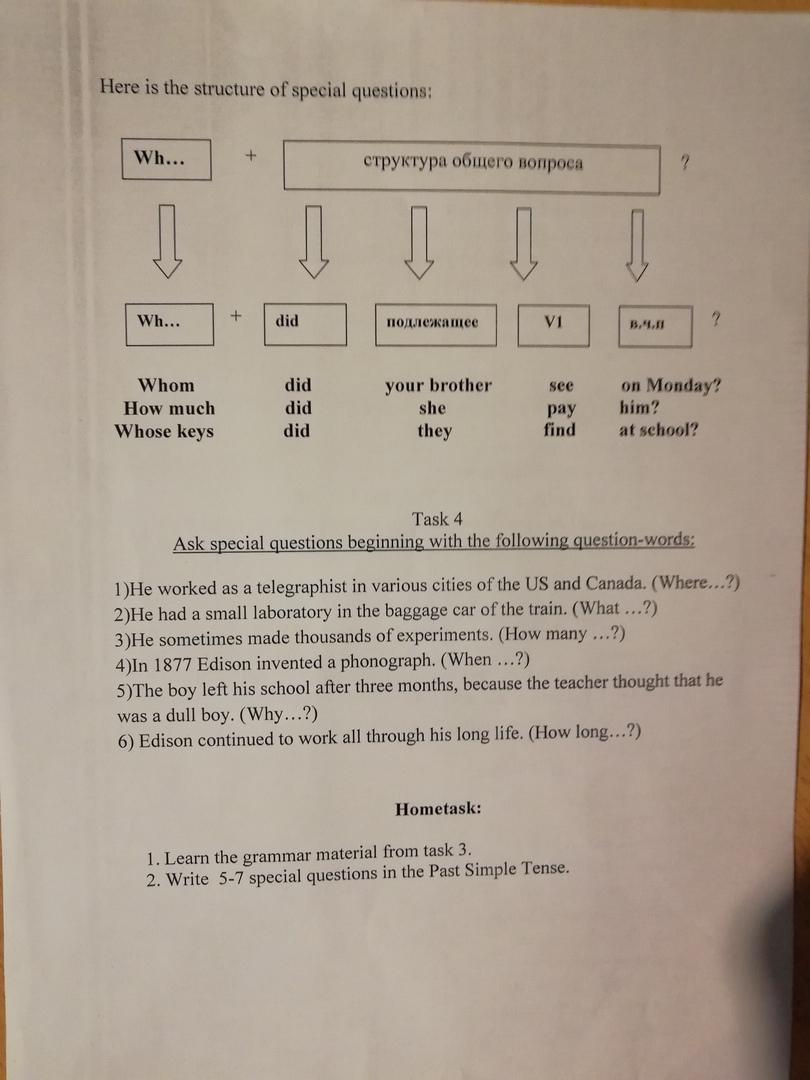 аккуратно перерисуйте схему специальных вопросов с примерами предложений (3 предложения + перевод пишите сами); 3)Выполните письменно Task 4, следуя схеме специальных вопросов.