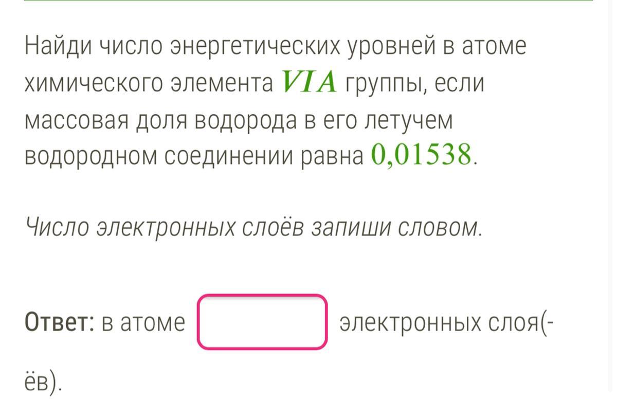3) В молекуле данного соединения неизвестный элемент представлен 1 атомом, значит, молярная масса этого элемента равна 128 г/моль. Смотрим в таблицу Менделеева: такую массу имеет Теллур. Он находится в 5 периоде, значит число энергетических уровней (электронных слоёв) в атоме равно 5.