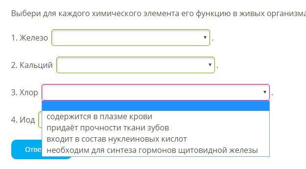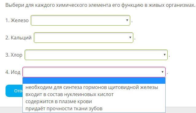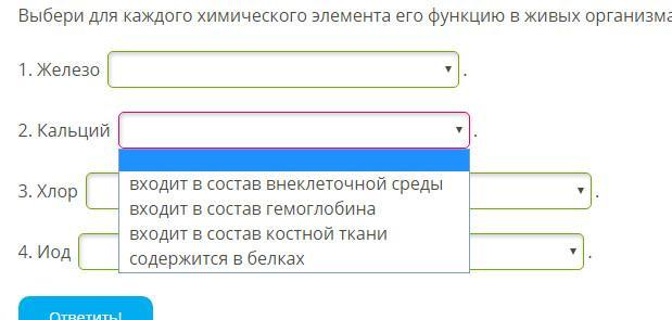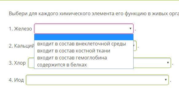 Выбери для каждого химического элемента его функцию в живых организмах.
