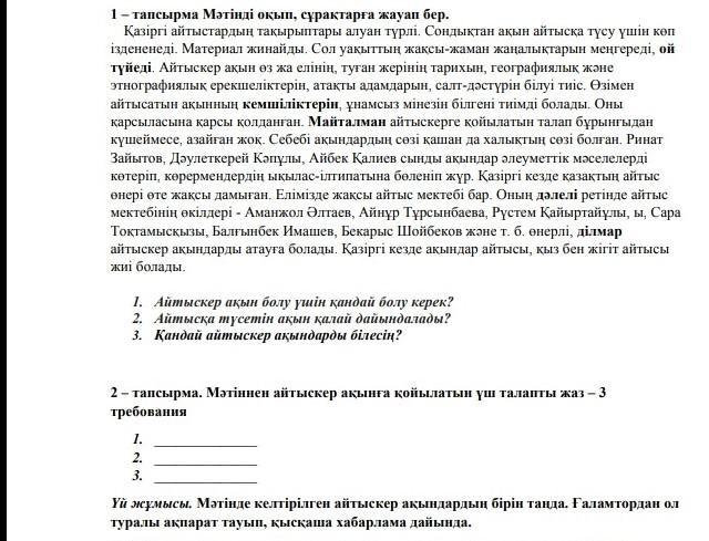 1) 1.айтыскер ақын өз елінің,туған жерінің тарихын,географиялық және этнографиялық ерекшеліктерін ,атақты адамдарын , салт-дәстүрін білуі керек.