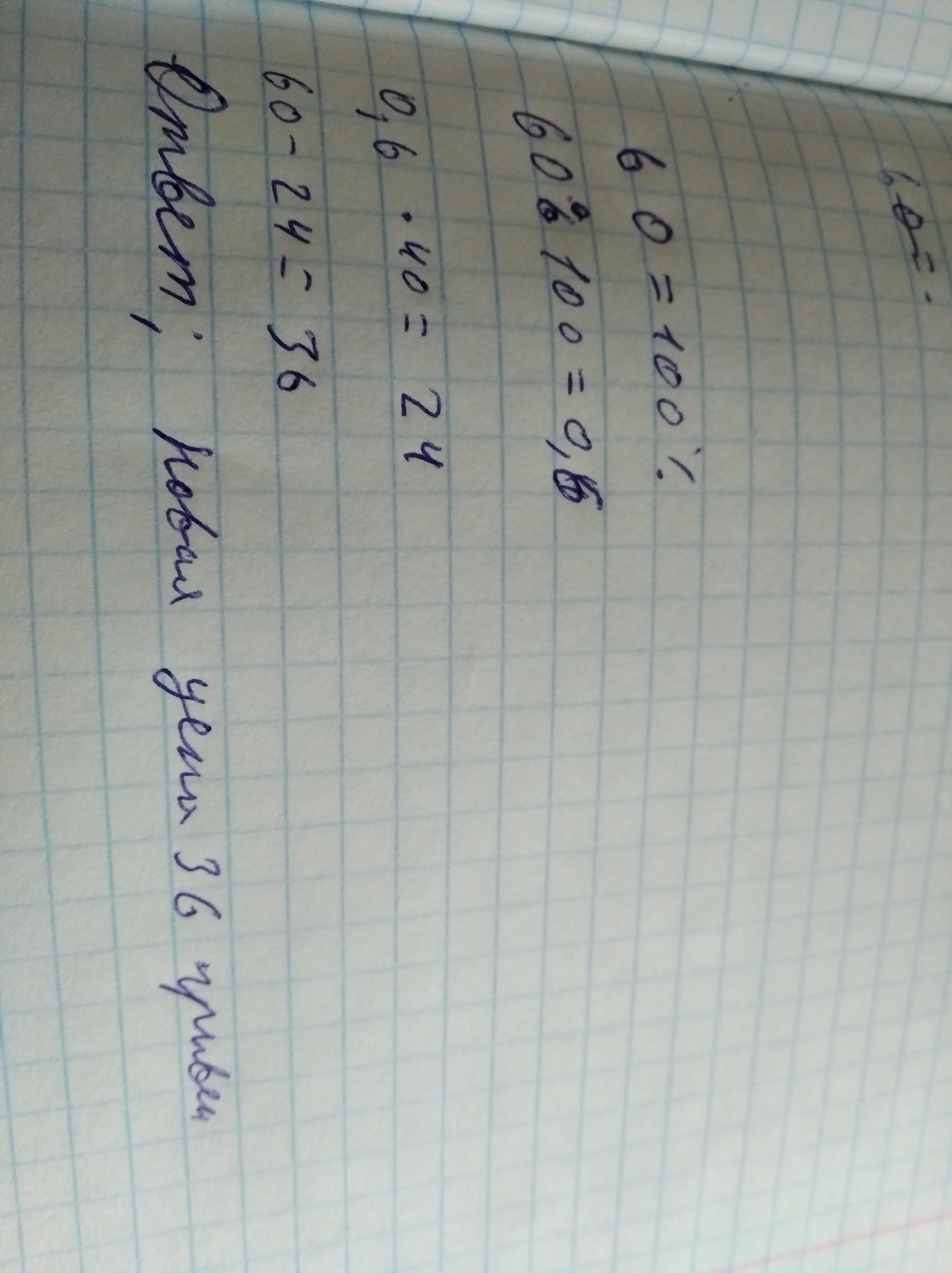 6 класс: Товар коштував 60 грн. Через деякий час його ціна знизилась на 40% . Вибачте нову ціну товару.