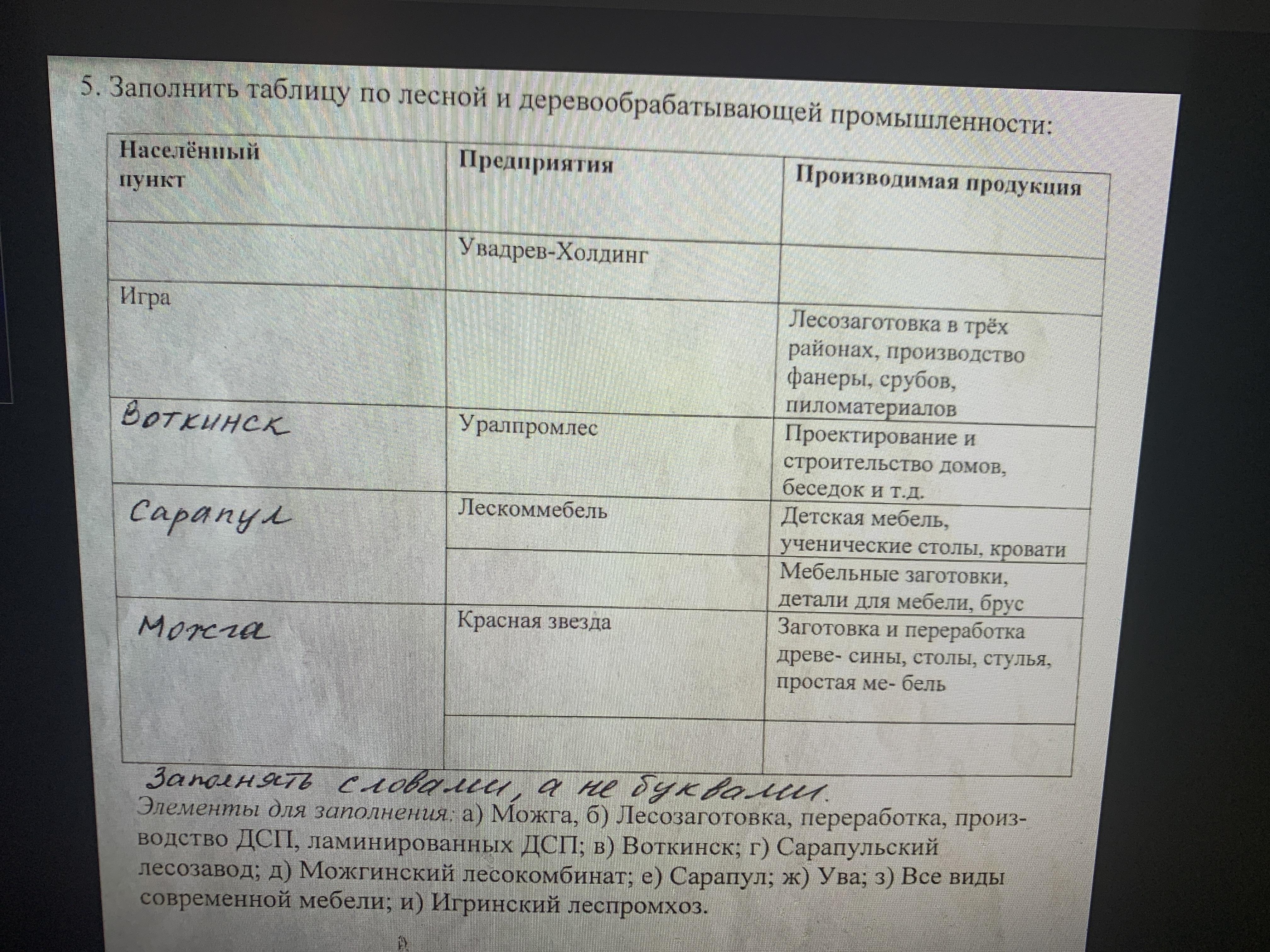 Первая строка третьего столбца: Лесозаготовка, переработка, производство ДСП, ламинированных ДСП.