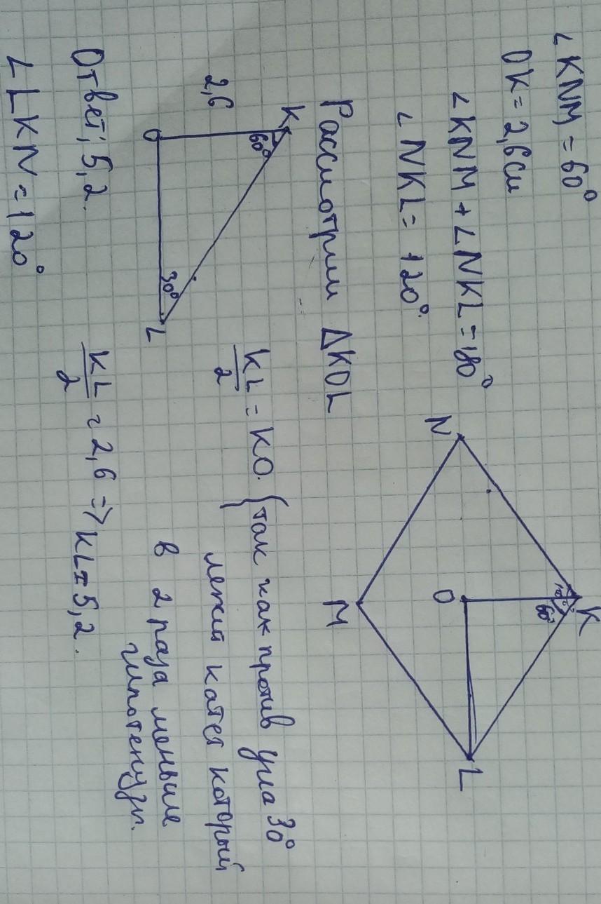 Вычисли сторону и тупой угол ромба, если угол KNM= 60 градусов и OK =2,6 см. ОЧЕНЬ СРОЧНО!! С ОБЪЯСНЕНИЕМ . ДАЮ МНОГО БАЛОВ . рисунок скинула