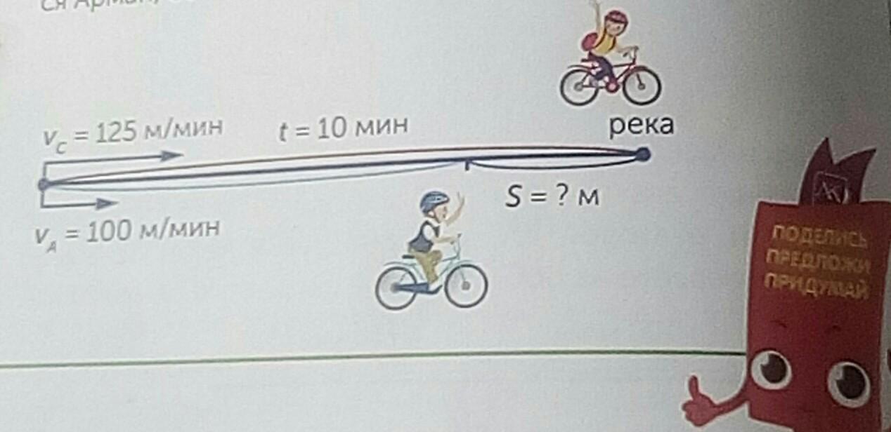 Серик и Арман одновременно выехали на велосепедах из поселка к реке . Через 10минут Серик , ехавшись со скоростью 125м/мин , был у реке . На каком расстоянии от него находился Арман, если он ехал со скоростью 100м/мин?