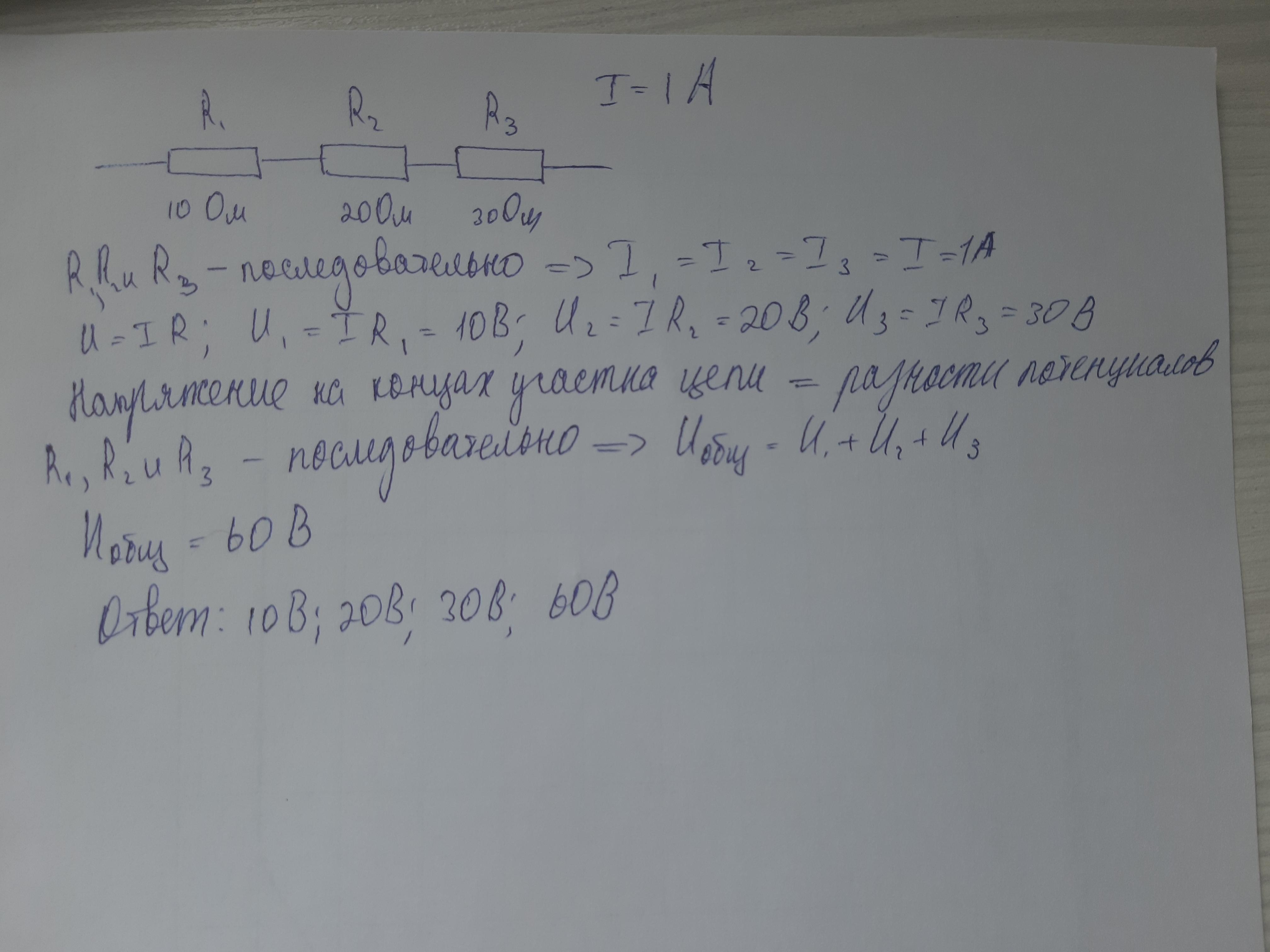 . Три проводника, сопротивления которых равны 10, 20 и 30 Ом, соединены последовательно. Определите напряжение на каждом из проводников и разность потенциалов между концами цепи при силе тока 1 А.