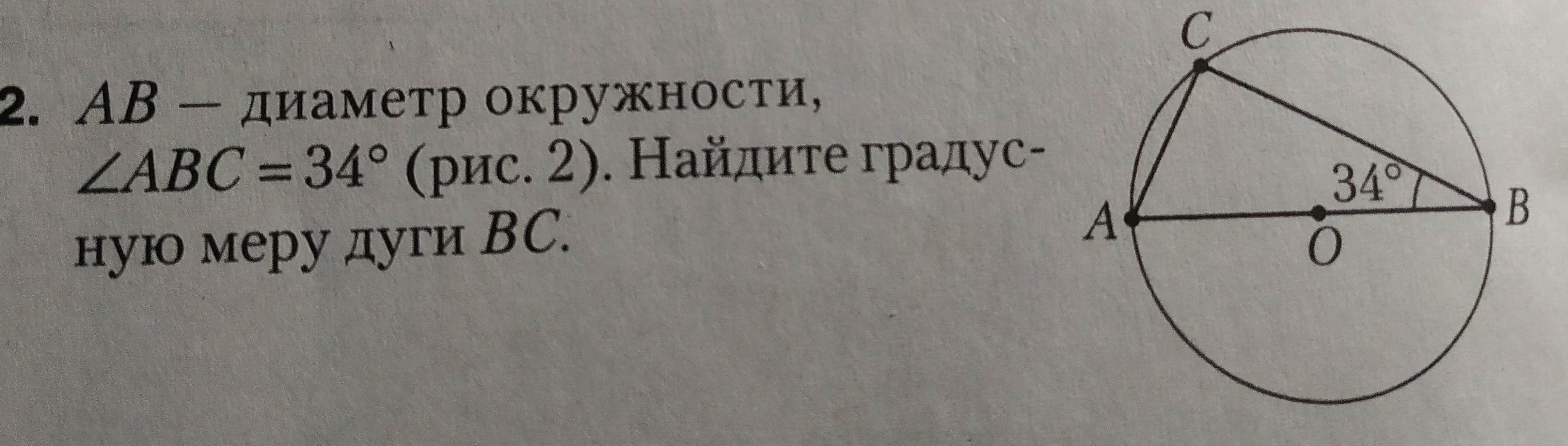 Рассмотрим ∆АСВ - прямоугольный. Угол САВ = 90°-34° = 56°. Угол САВ - вписанный, а значит равен половине градусной мере дуги СВ. Дуга СВ = 56°*2 = 112°.