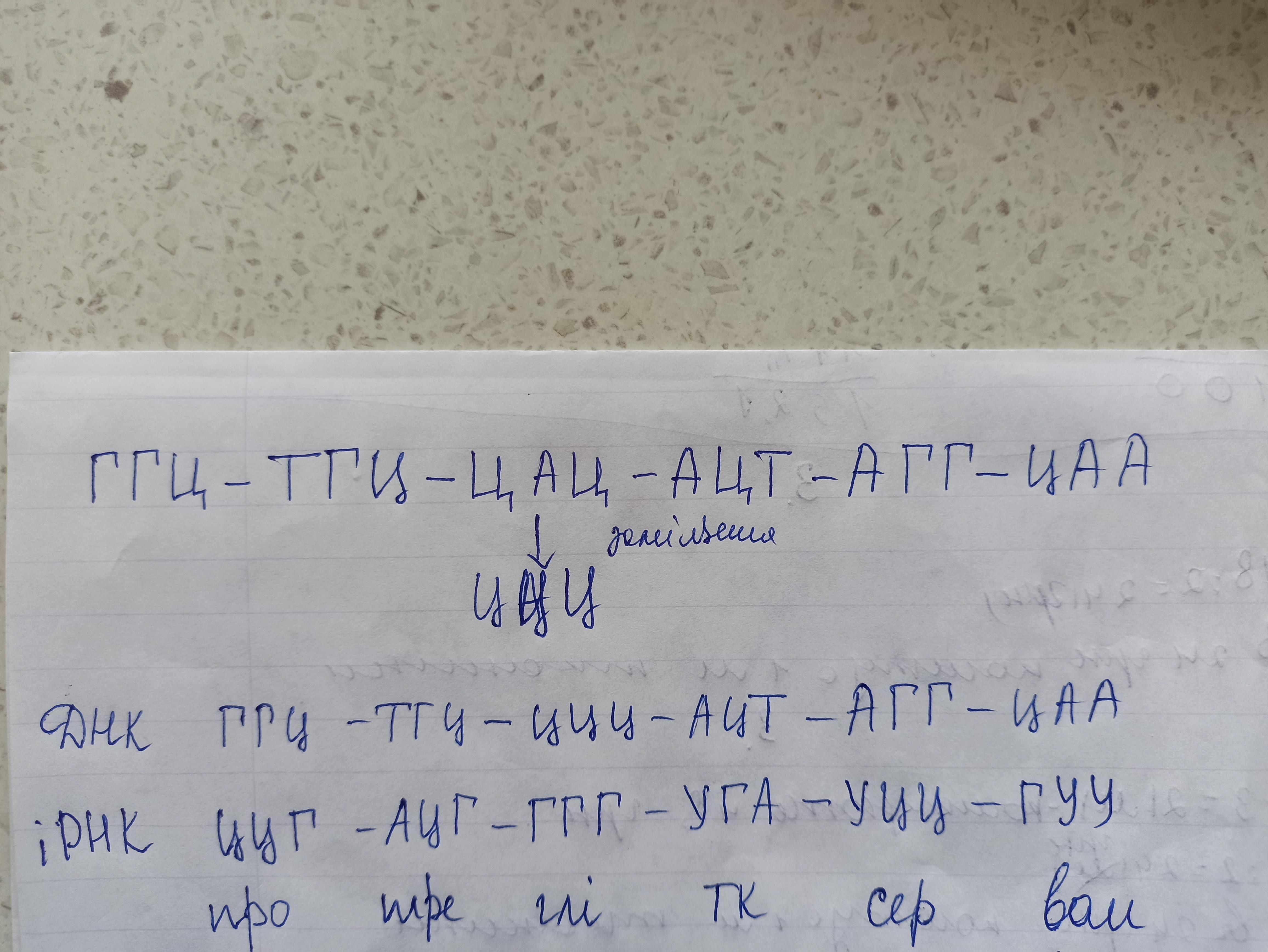 У результаті мутації на ділянці гена - ГГЦ ТГЦ ЦАЦ АЦТ АГГ ЦАА - відбулося заміщення в третьому триплеті : замість аденіну виявлено цитозин Запишіть амінокислотний склад поліпетиду\