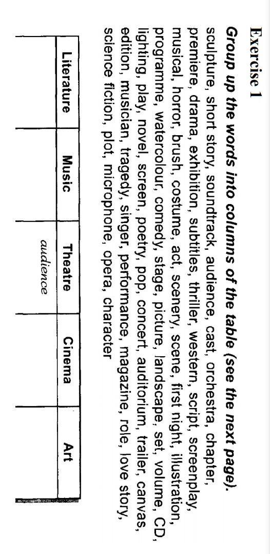 Theatre:audience,drama,script,screenplay,musical,costume,act,programme,play,screen,auditorium,tragedy,performance,role,plot,opera,character