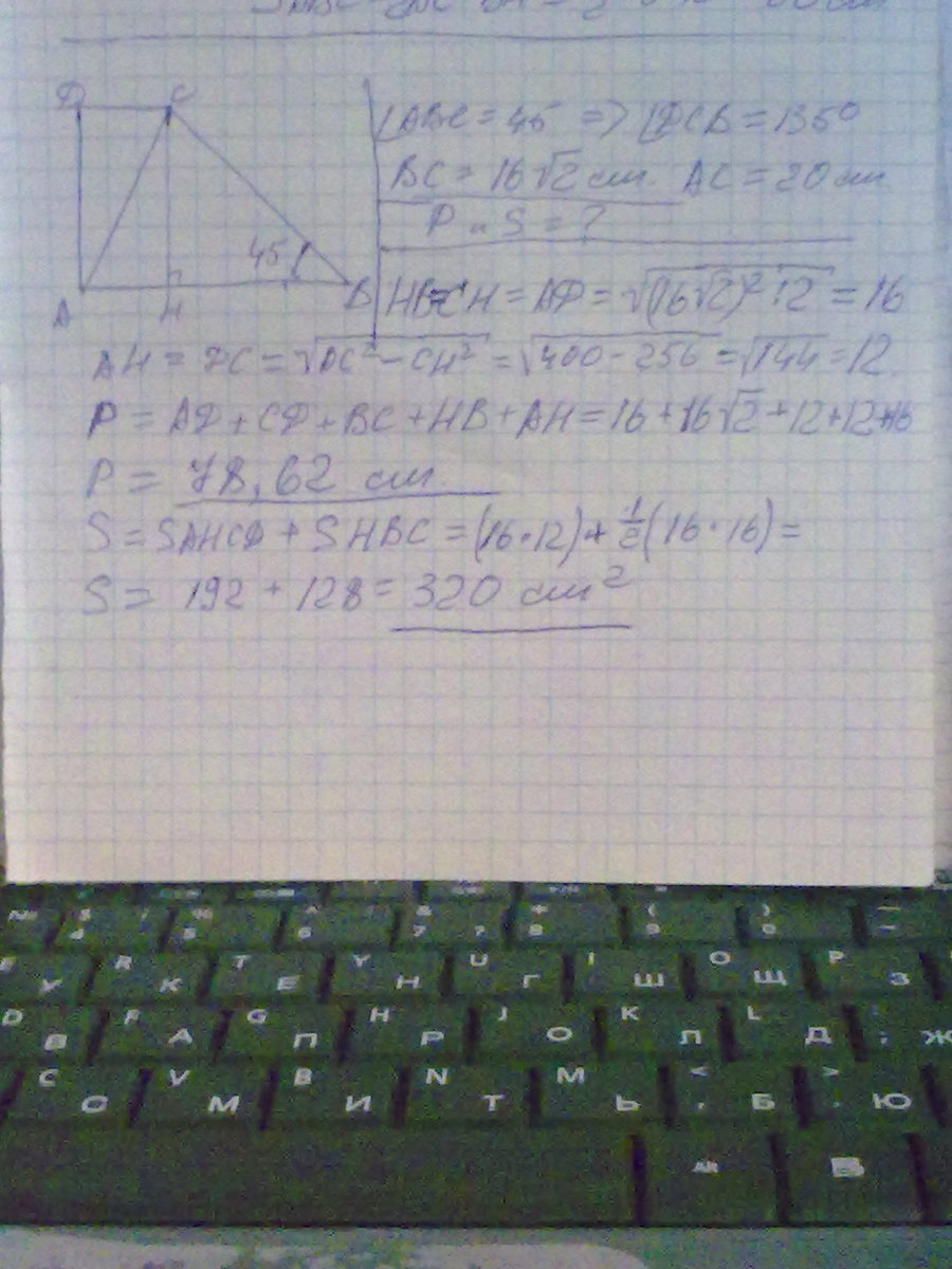 В прямоугольной трапеции с острым углом 45° большая боковая сторона равна 16√2см, а меньшая диагональ равна 20см. Найдите периметр и площадь трапеции