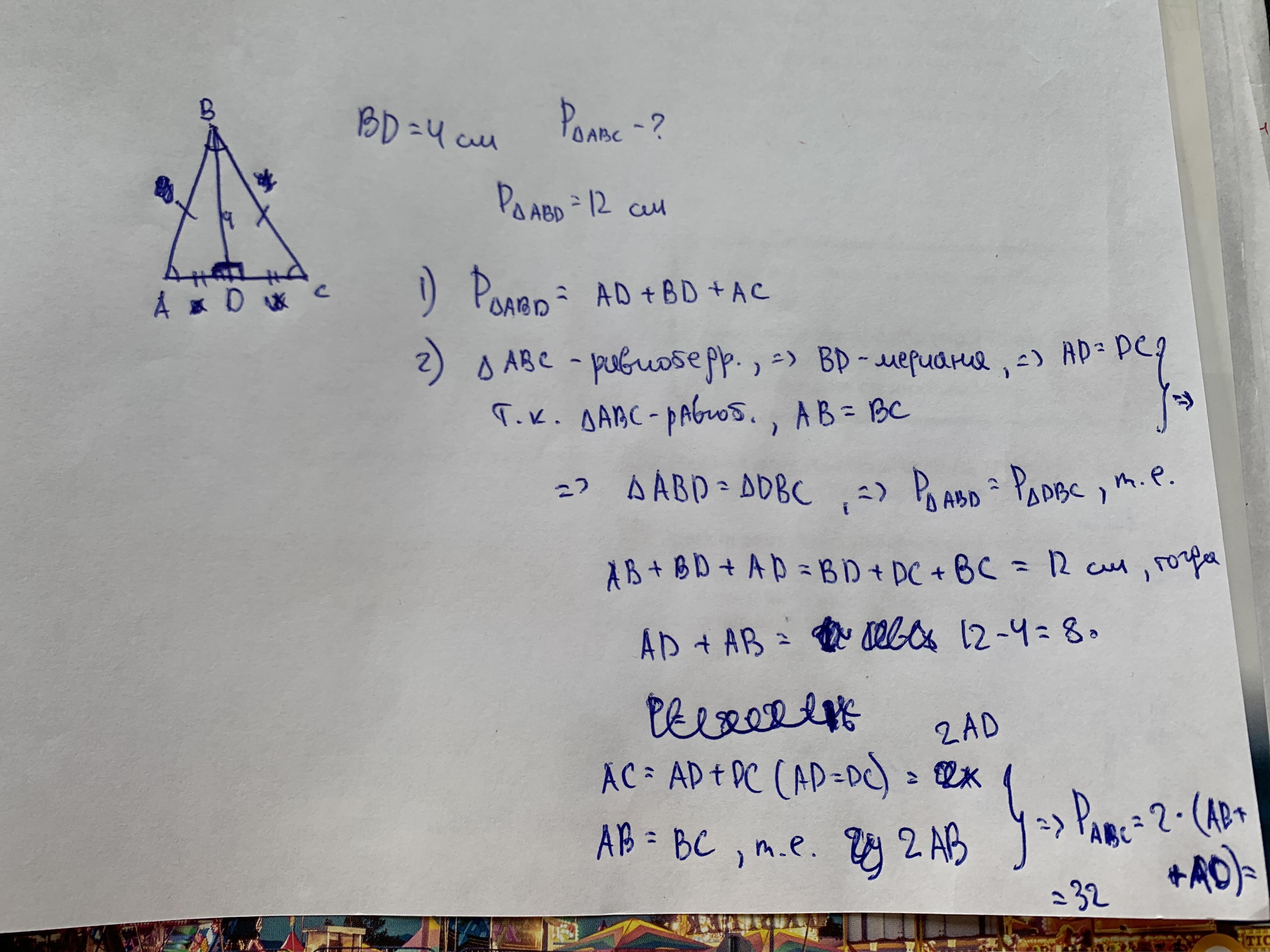 В равнобедренном треугольнике АВС угол В - тупой. Высота ВD равна 4 см. Найдите периметр треугольника АВС, если периметр треугольника АВD равен 12 см.