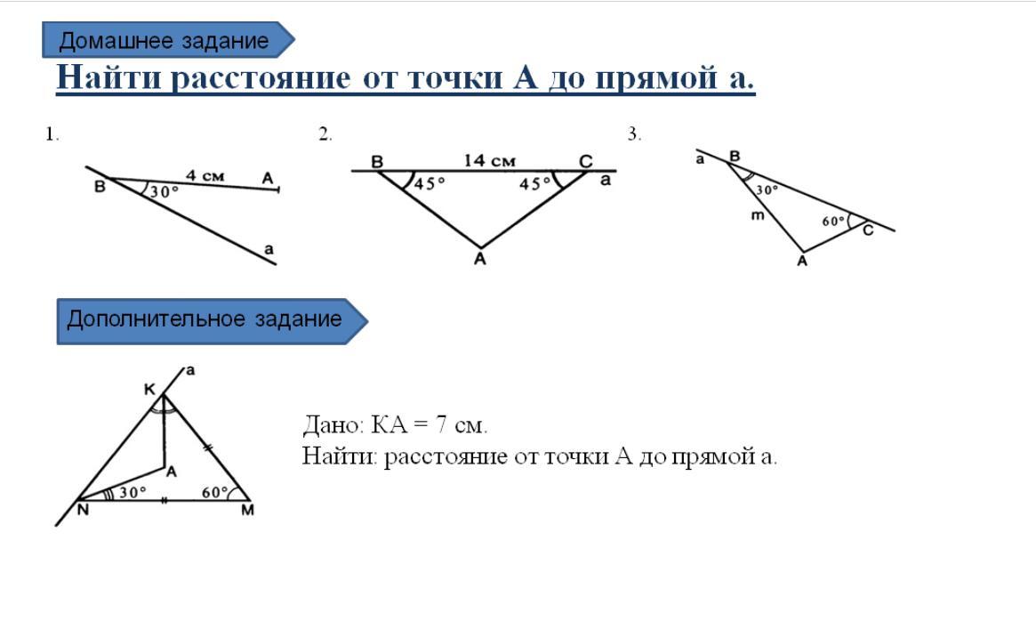 4. Большой треугольник равнобедренный, следовательно, его углы при основании равны. То есть угол NKA равен 30 градусов.(180-60=120. 120\2=60. 60\2=30.Опустим перпендикуляр из точки А на прямую а. Получили прямоугольный треугольник с углом в 30 градусов. То есть длина искомого перпендикуляра равна половине длины отрезка КА и равна 3,5 см.
