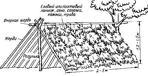 После этого на рогатины положи жердь и, в случае необходимости, закрепи места соединения элементов проволкой или прочной верёвкой. Что ж, часть работы уже позади. Теперь тебе потребуется собрать ещё несколько толстых веток деревьев (жердин), которые в дальнейшем станут опорой для укладывания кровельного материала типа камыша, сена, соломы или еловых лап. Кстати, советуем поставить жердины впритык друг к другу. В таком случае укрывать стенки чем-то ещё вовсе не потребуется. Однако в большинстве случаев боковые жердины ставят на расстоянии не менее 20 сантиметров друг от друга. Если ты замечаешь, что каркас недостаточно надёжен и в любой момент может обвалиться, усиль его поперечными ветками, которые необходимо прикрепить к жердинам. Теперь настало самое время уложить лапником (или другим подручным материалом) обрешётку. При этом начинать работу нужно с самого низа. Делается это для того, чтобы каждый последующий ряд накрывал предыдущий. В результате получится надёжная защита внутреннего пространства шалаша от попадания влажности. Таким же образом сооруди и заднюю стенку конструкции, оставив открытым лишь вход.