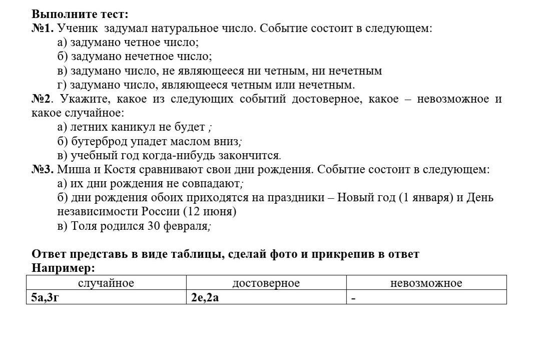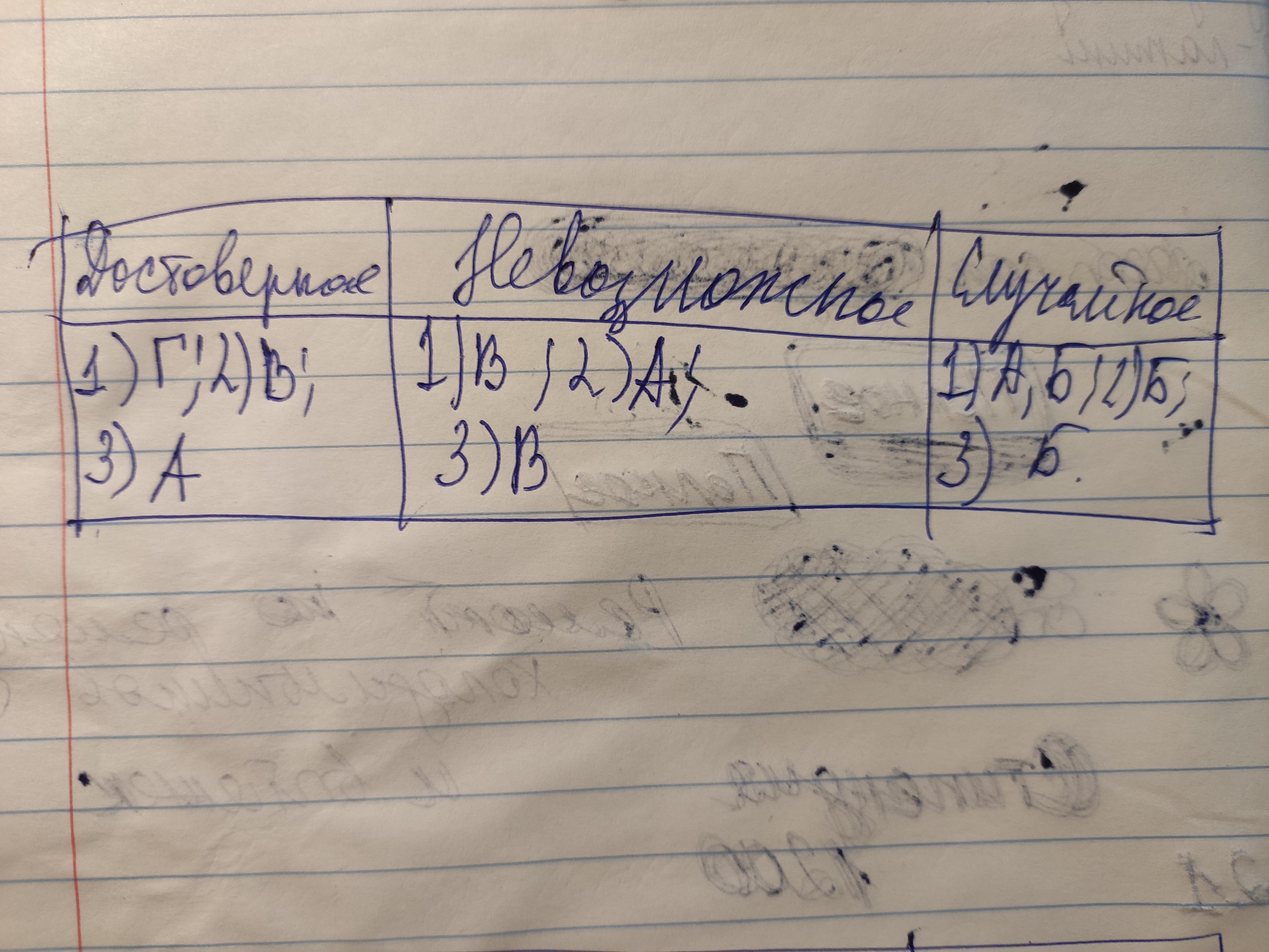 Ответ: 1-г; 2- а- невозможное; б- случайное; в- достоверное; 3- а