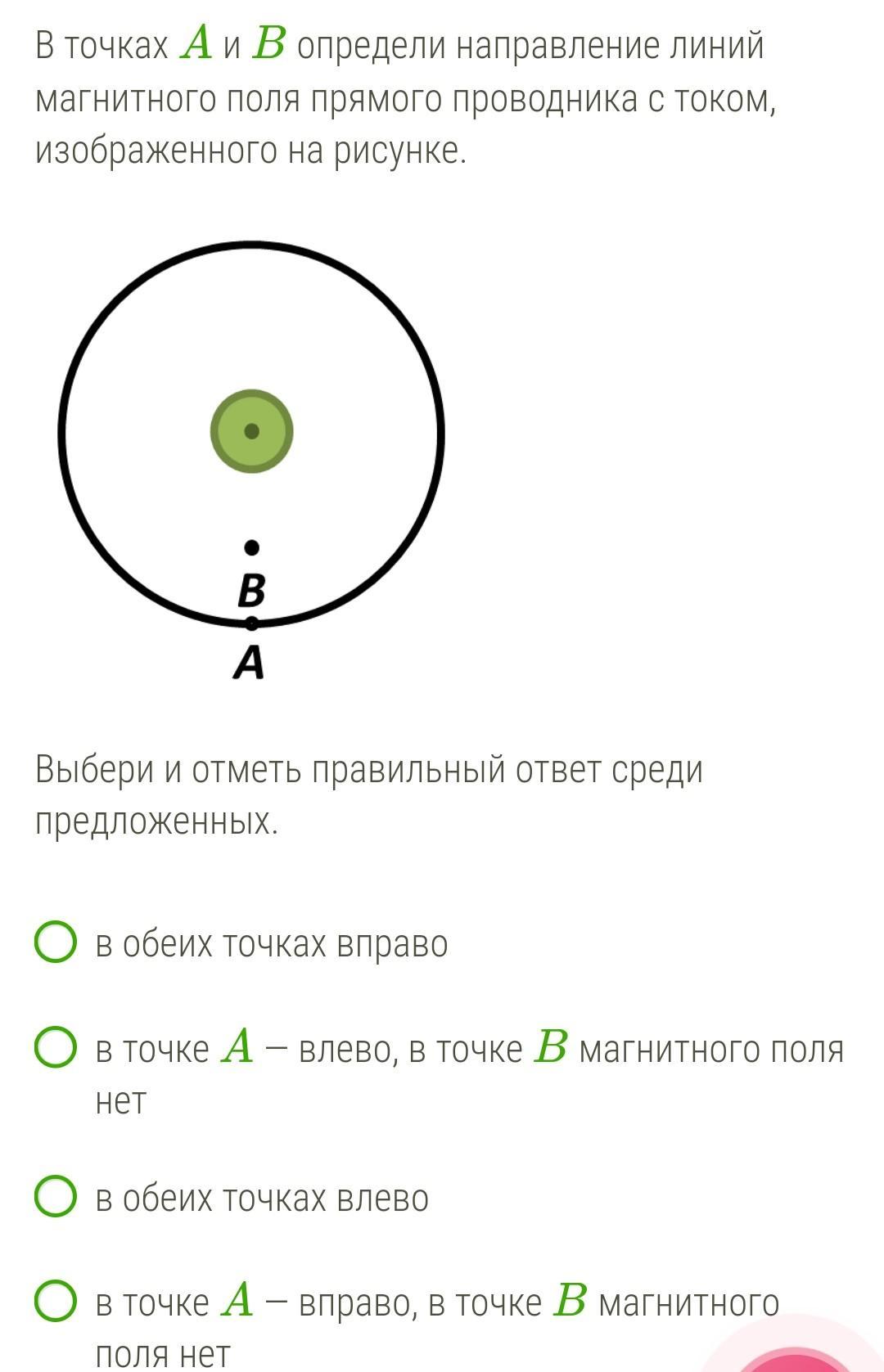 В точках A и B определи направление линий магнитного поля прямого проводника с током, изображенного на рисунке.Выбери и отметь правильный ответ среди предложенных.