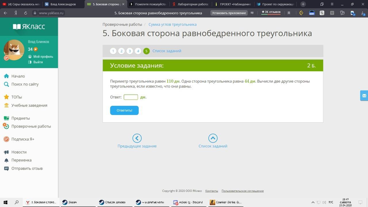 Объяснение: периметр 110 дм, а одна сторона 44 дм. Треугольник равнобедренный.