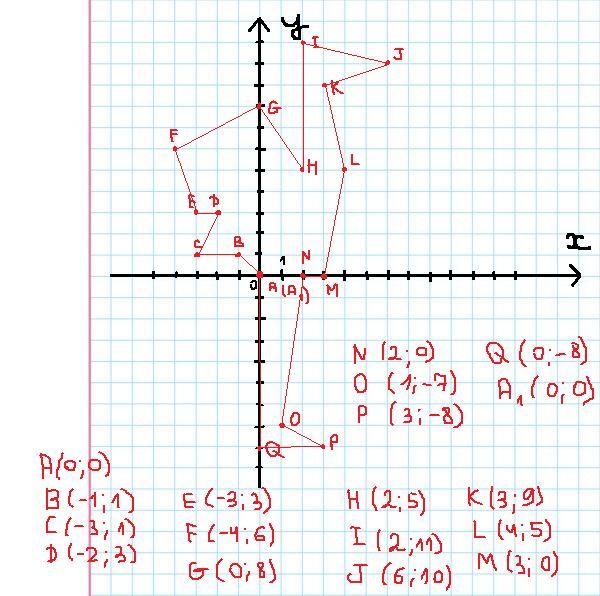 1) Постройте координатную плоскость. Отметьте и последовательно соедините следующие точки (0;0), (-1;1), (-3;1). (-2;3), (-3;3), (-4;6), (0;8), (2;5), (2;11), (6;10), (3;9), (4;5), (3;0), (2;0),(1; -7), (3;-8), (0;-8), (0;0).
