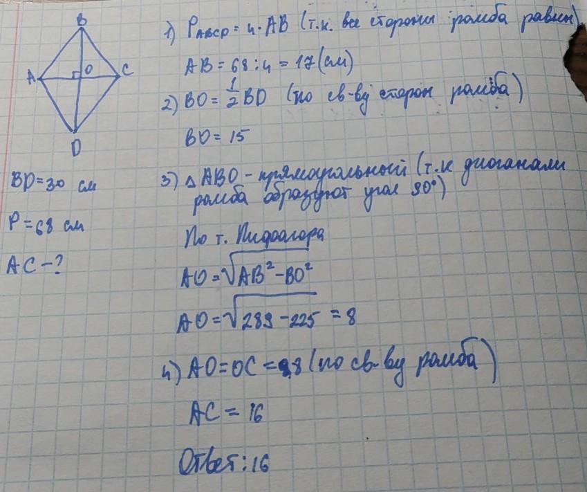 одна з діагоналей ромба дорівнює 30 см. знайти іншу діагональ ромба, якщо його периметр дорівнює 68 см