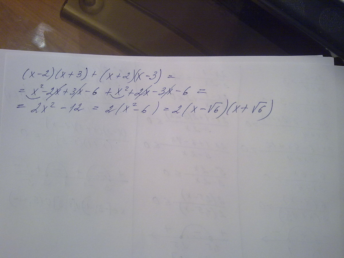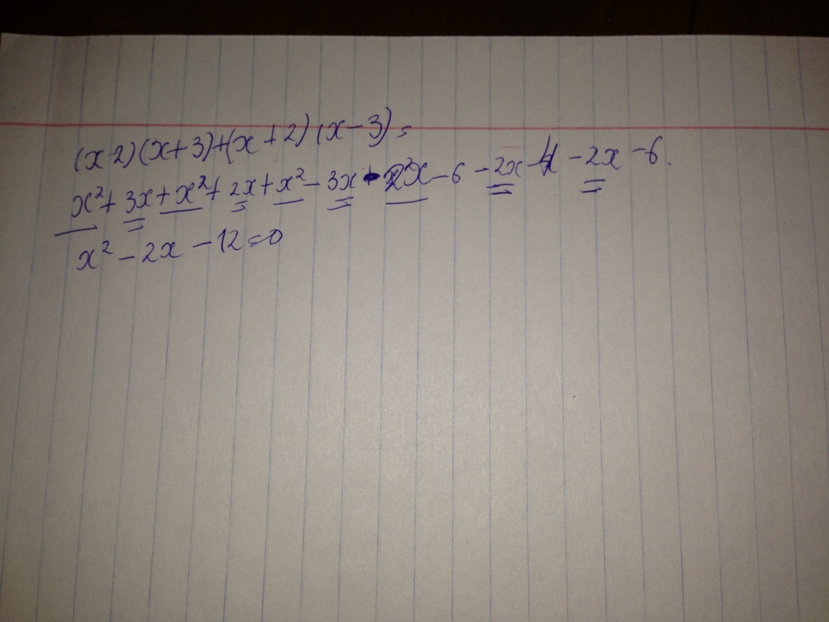 (x-2)(x+3)+(x+2)(x-3)= x2+3x+x2+2x+x2-3x-2x2-6-2x-4-2x-6 = x2-2x-12=0