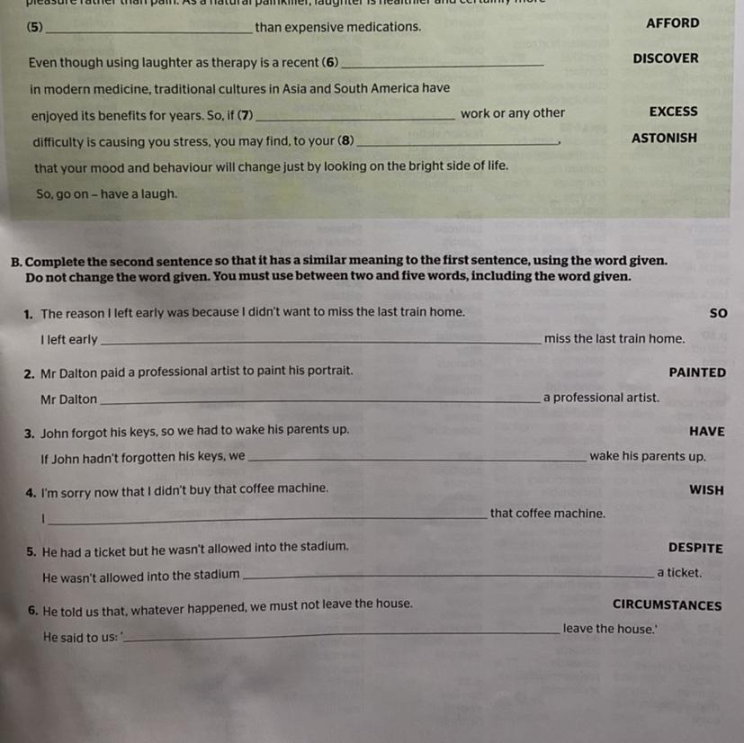 B. Complete the second sentence so that it has a similar meaning to the first sentence, using the word given. Do not change the word given. You must use between two and five words, including the word given.