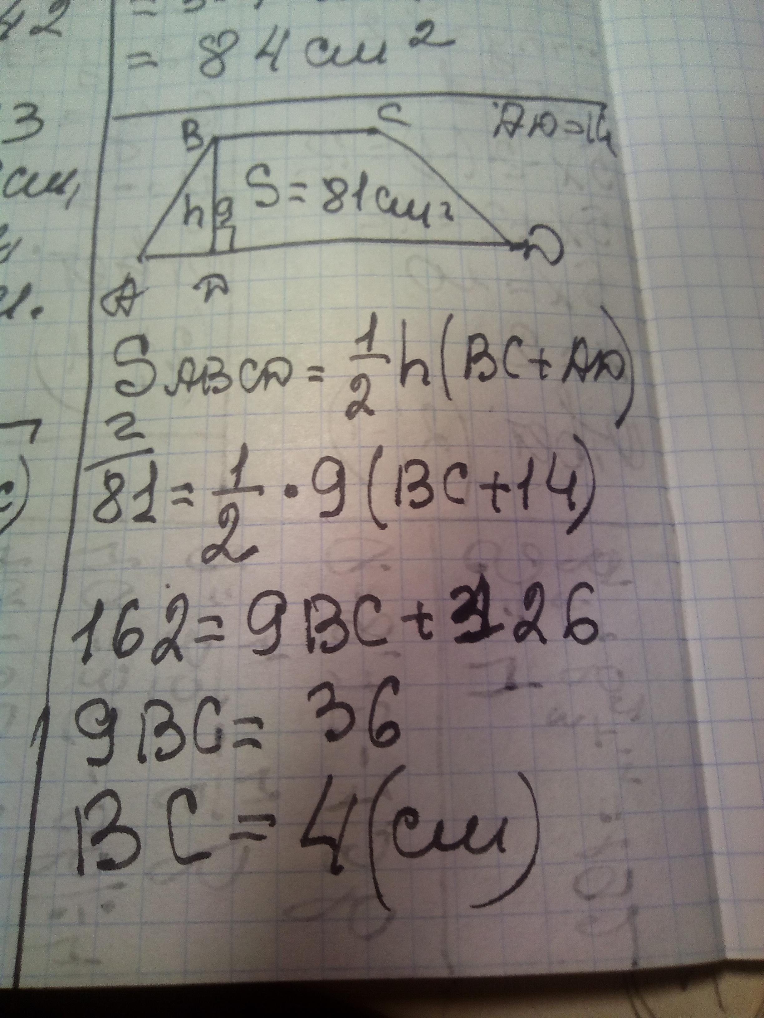 Площа трапеції 81 см2. Її висота дорівнює 9 см, а одна з основ - 14 см. Знайдіть другу основу трапеції.