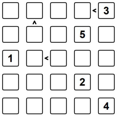 Заполните клетки числами 1, 2, 3, 4, 5, учитывая знак неравенства так, чтобы в каждой строке и в каждом столбце каждое число было записано один раз. Какое число будет записано в нижней строке слева (в угловой клетке)? СРОЧНО ПОМОГИТЕ!!!!