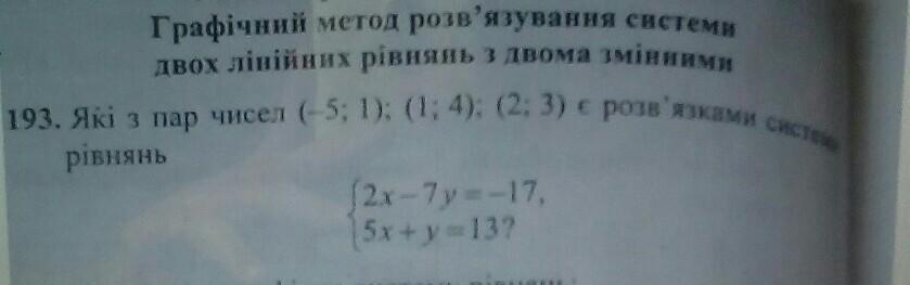 які з пар чисел (-5;1); (1;4); (2;3) є розв'язками рівнянь 2х-7у=-17;