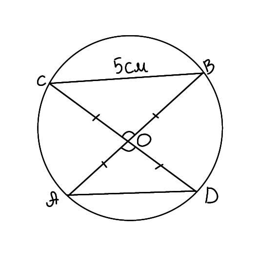 CO < CD в два раза, так как радиус меньше диаметра окружности. Поэтому, СО = ОВ = 50 см:2 = 25 см. P∆COB = 25 см+ 25см + 5 см = 55 см = P∆AOD.