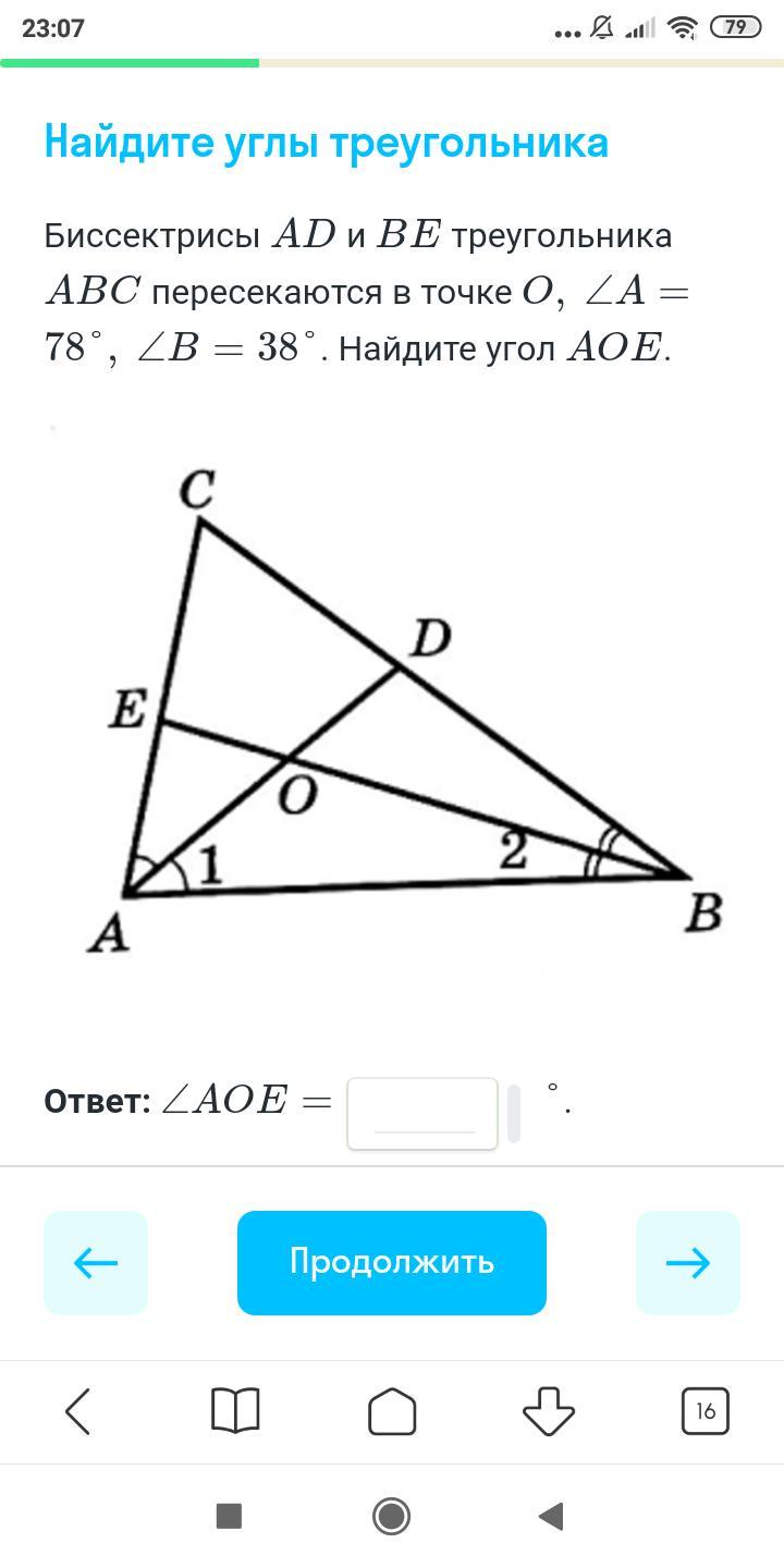 Биссектрисы АD и BE треугольника ABC пересекаются в точке О, угол А равен 78 градусов, угол B равен 38 градусов