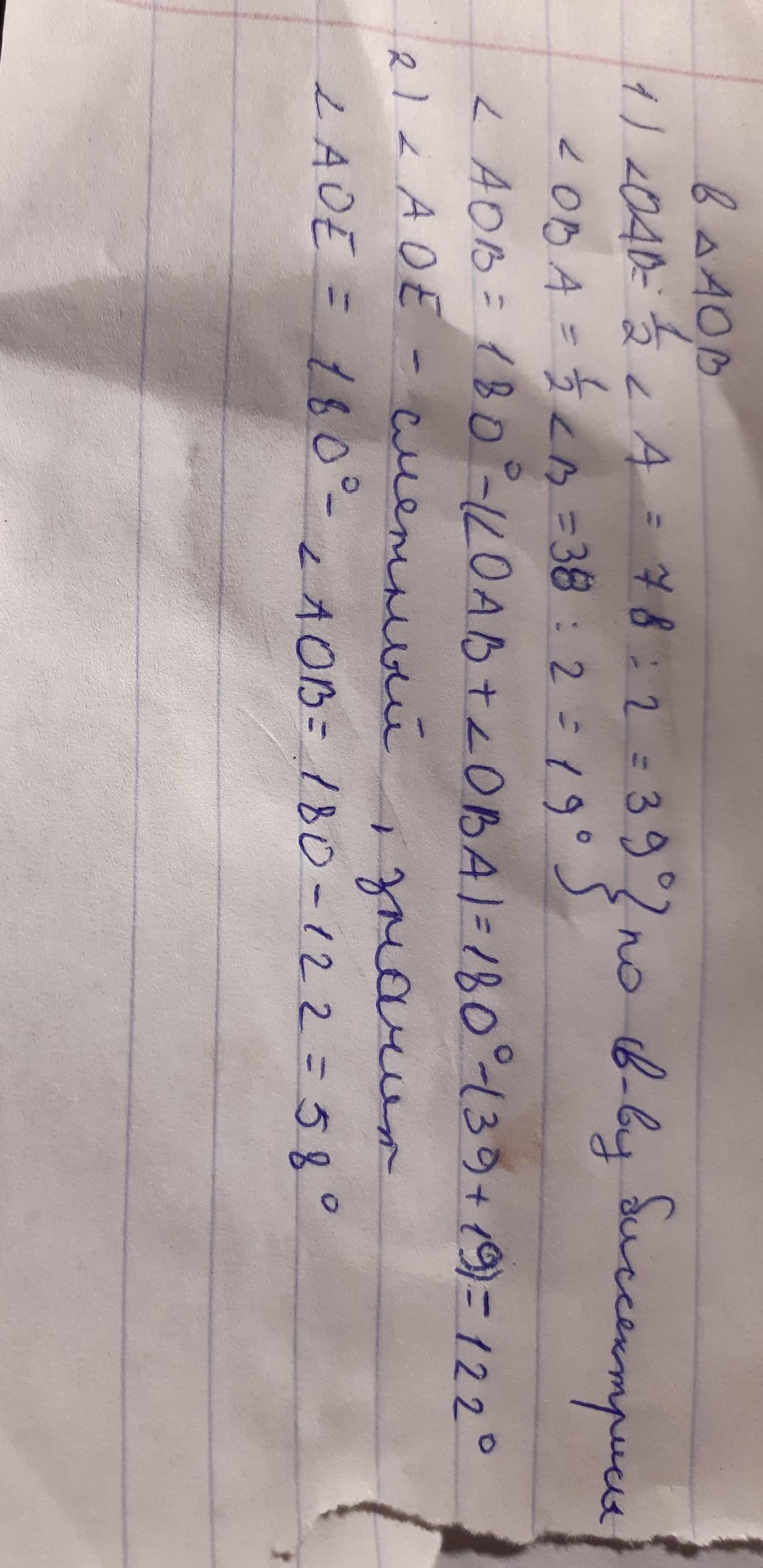 1) ∠ОАВ= 78:2=39°, так как АД - биссектриса;