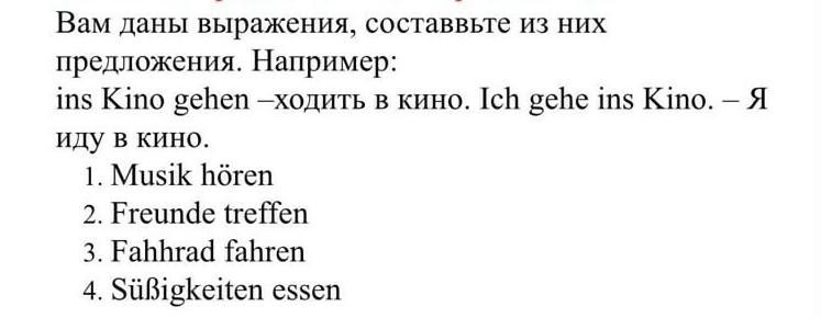 Ich höre Musik. Katja isst Süßigkeiten. Petya geht mit Freunden spazieren. Wova fährt Fahrrad.