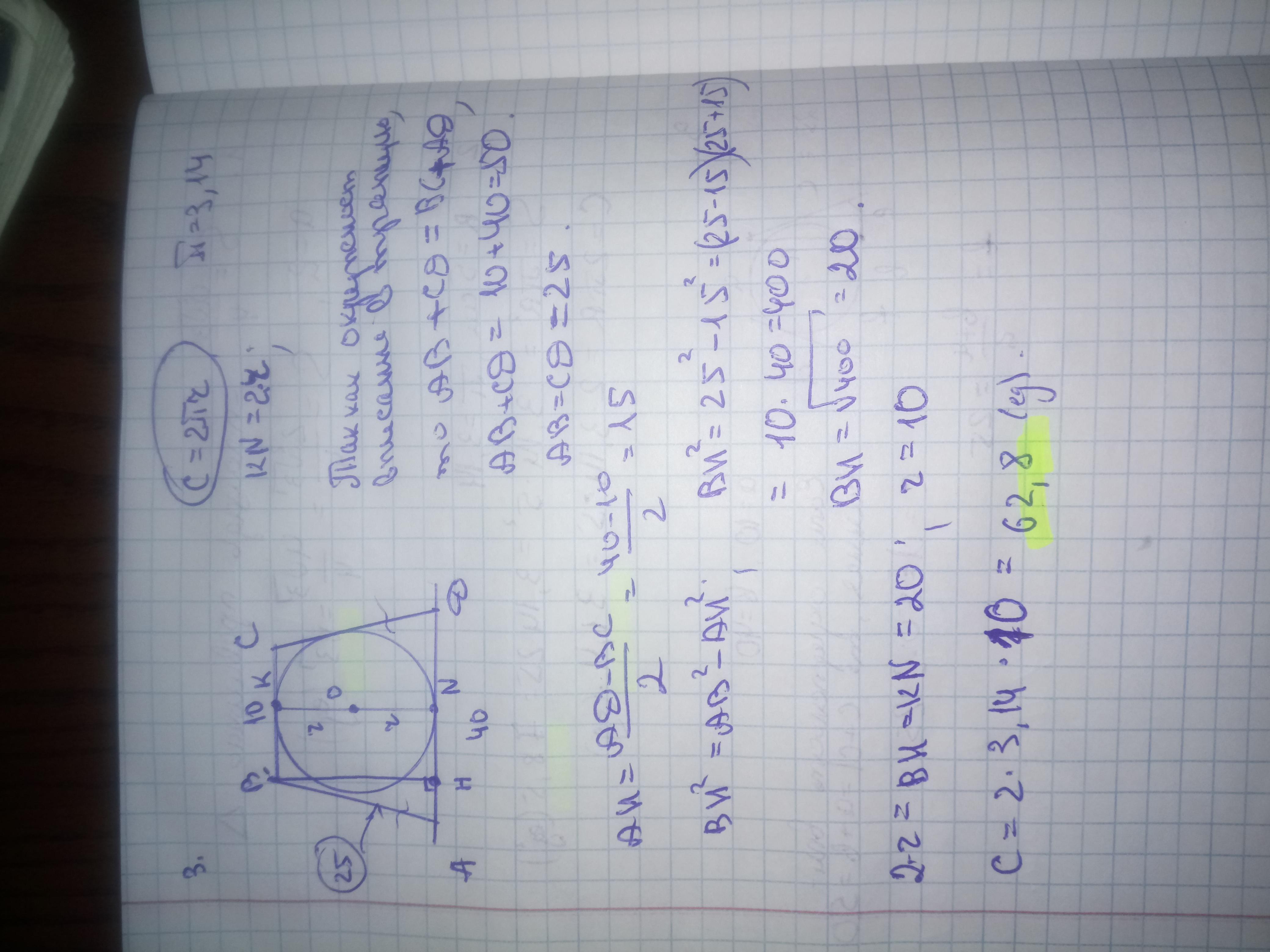 Равнобедренной трапеции с основаниями 10 и 40 описанного около окружности найдите длину этой окружности